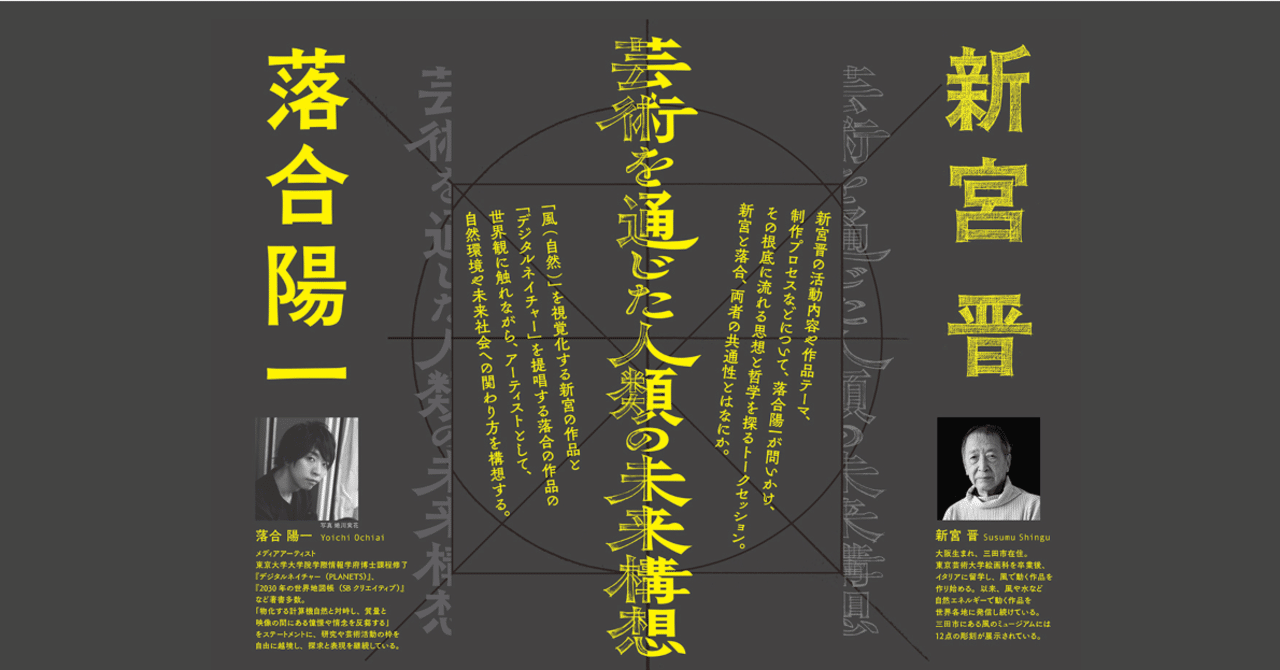 トークセッションでは、風や水で動く彫刻で知られる世界的な造形作家 新宮晋氏の活動内容や作品テーマ、制作プロセスなどについて、 「デジタルネイチャー」を提唱する落合陽一氏が問いかけ、その根底に流れる思想と哲学を探ります。